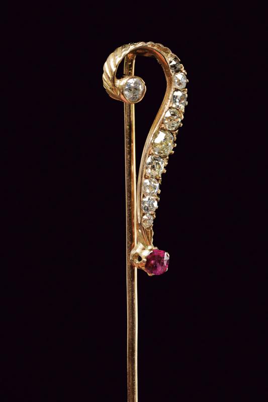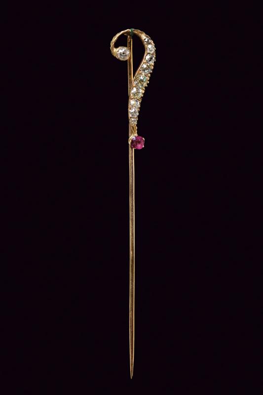 Spilla da cravatta in oro rosa 750/000 con diamanti taglio rosetta e taglio vecchio e rubino. Peso 2,1 gr.