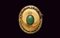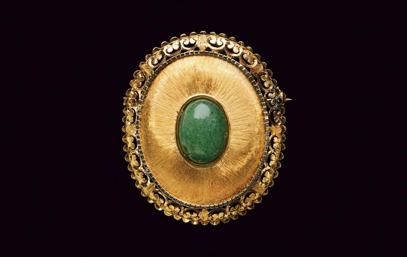 Spilla/ pendente ovale in oro 750/000 con cabochon centrale di giada di grandezza mm 16 x12. Misure della spilla mm 45 x 40, peso 13 gr.