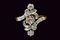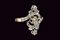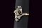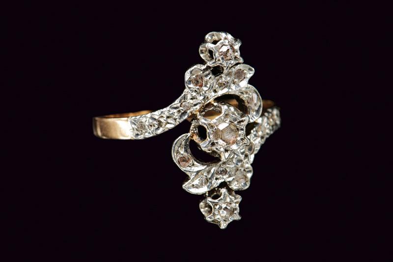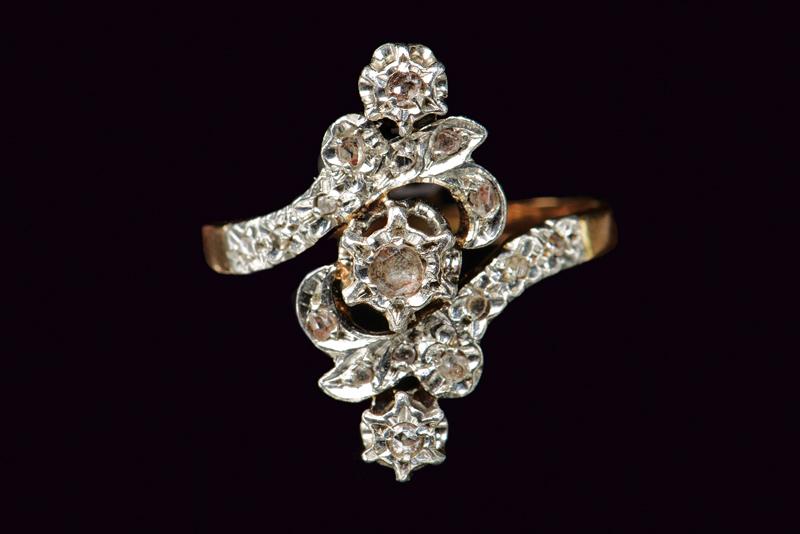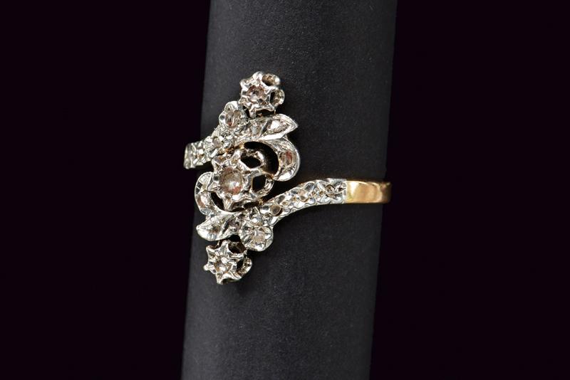 Anello montato con tre diamanti con taglio rosetta incastonati verticalmente (circa 0.07 ct, 0.035 ct, 0.02 ct) in una montatura realizzata in oro rosa ed argento. Punzone francese di titolo per l'oro 750/000 *testa di cavallo*. Misura 13 peso 3,46 gr.