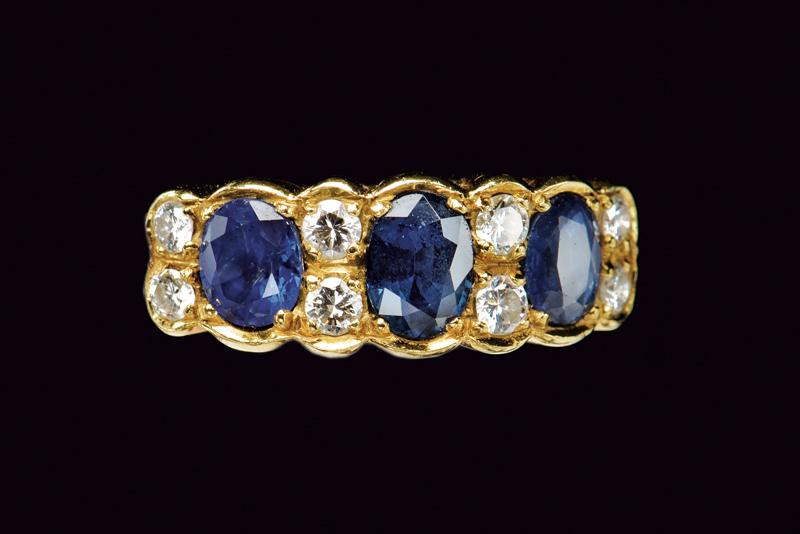 Anello in oro giallo 750/000 con zaffiri e diamanti alternati a fascia, ogni zaffiro alternato da due diamanti per un totale di 3 zaffiri taglio ovale ed 8 diamanti taglio brillante tutti incastonati a griffes. Peso totale stimato dei diamanti 0.56 ct, degli zaffiri 1.0 ct. Misura 12,5, peso 5.6 gr