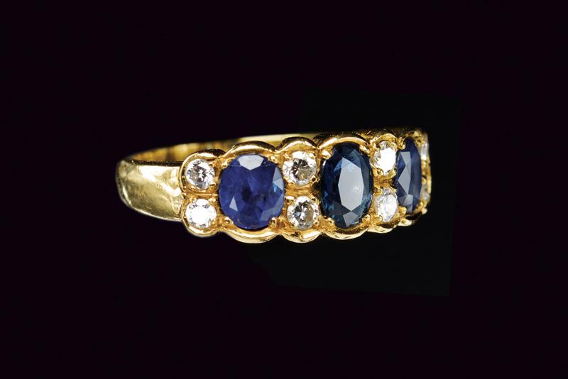 Anello in oro con zaffiri e diamanti alternati a fascia
