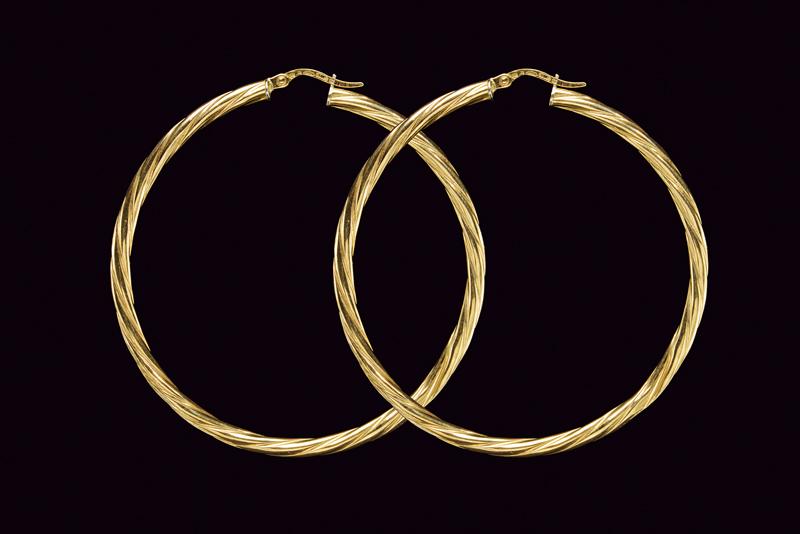 Orecchini a cerchio in oro giallo 750/000 firmati UNOAERRE, modello canna vuota lavorata, diametro 55 mm, peso 5,4 gr