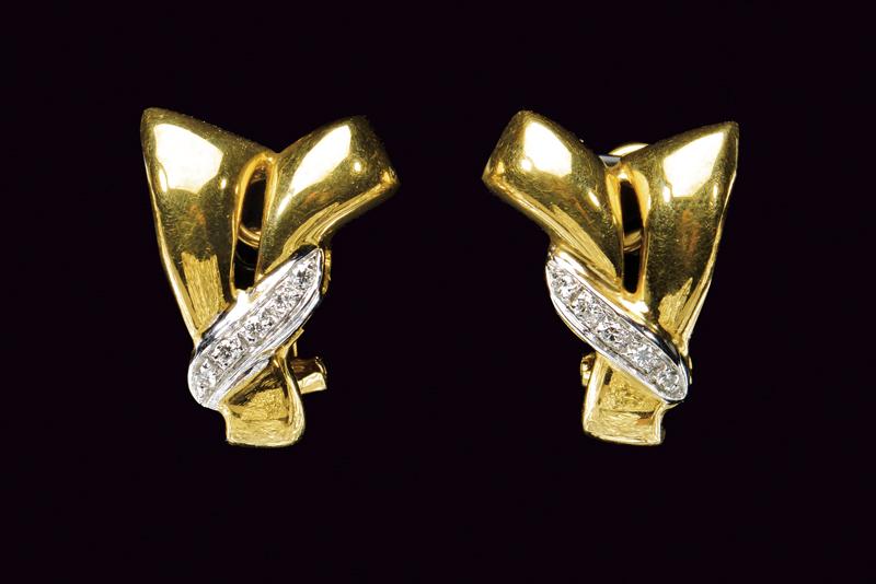 Paio di orecchini in oro giallo 750/000 ciascuno impreziosito da cinque diamanti taglio brillante disposti a pavè. Peso totale 9 gr