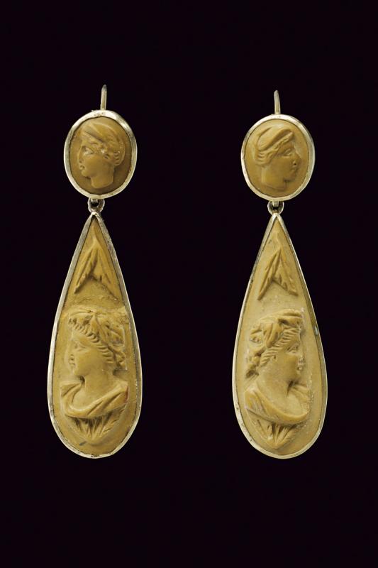 Orecchini pendenti in pietra lavica lavorata riportanti figure con profili classici femminili montati in metallo. Lunghezza 5,5 cm, peso 9.0 gr
