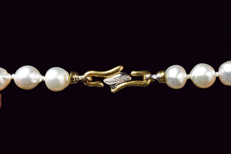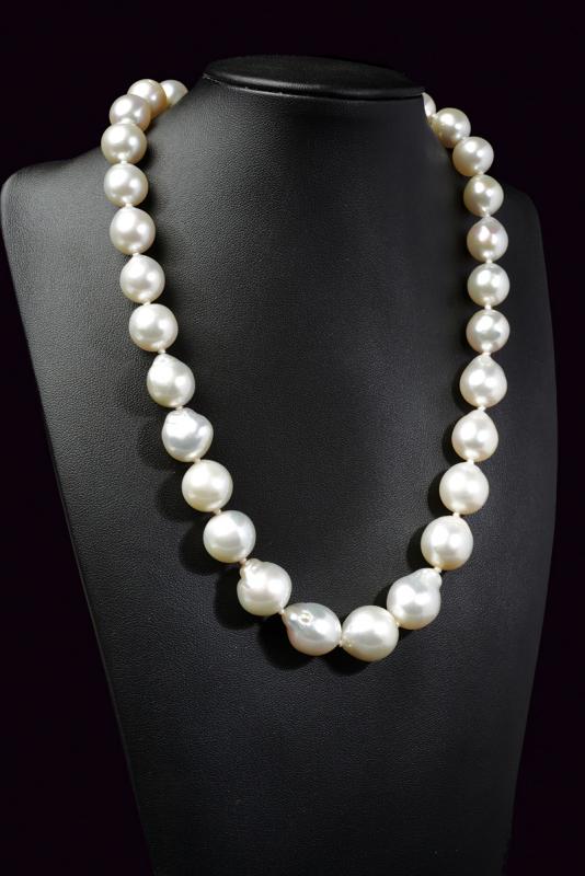 COLLANA formata da ventinove perle australiane degradè da mm 12/17, fermezza in oro 750/000 con piccoli diamanti taglio brillante. Lunghezza cm 46, peso 92 gr