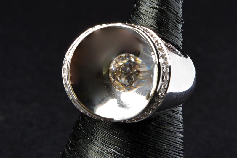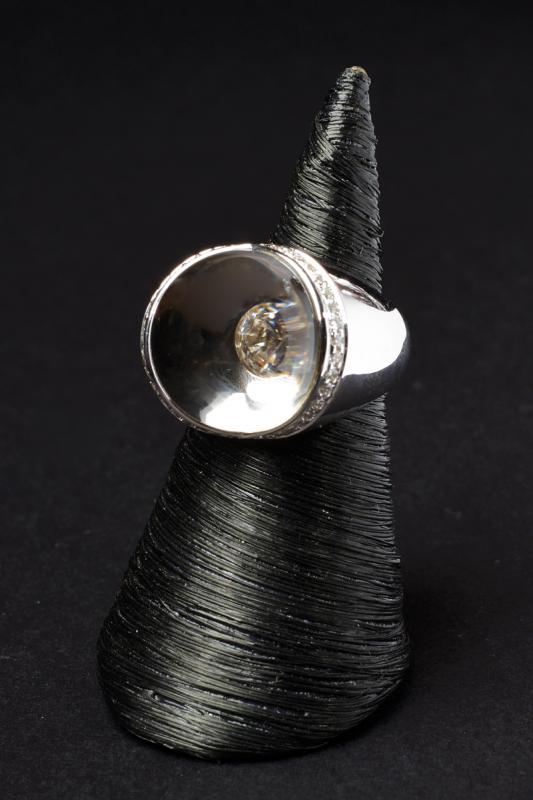 MAUBOUSSIN, anello in oro bianco, diamanti e cristallo di rocca con un diamante taglio brillante incastonato all'interno del cabochon in cristallo di rocca, a sua volta contornato da 0.5 ct di diamanti taglio brillante. Punzoni orafi e firma, misura 12, peso 23,7 gr