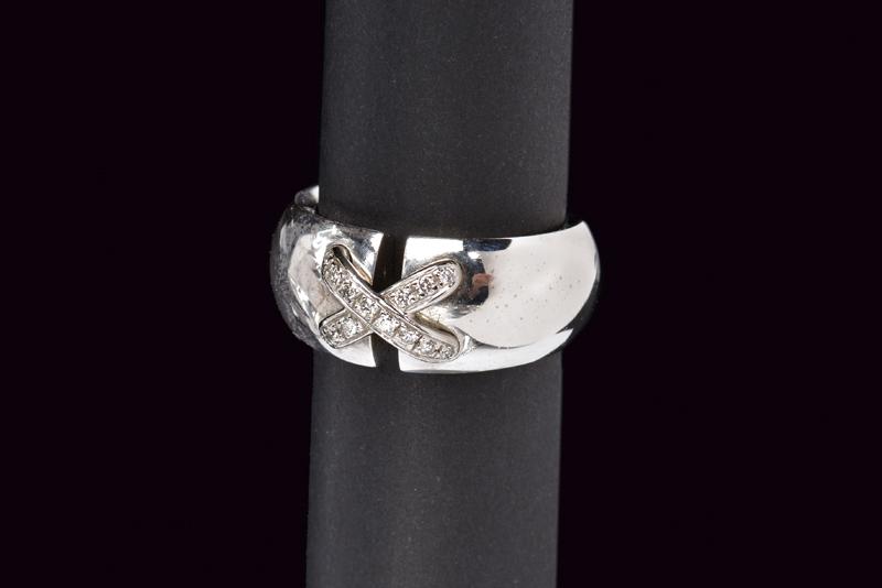 CHAUMET anello a fascia in oro bianco 750/000 con diamanti tondi taglio brillante disposti in due file incrociate. Marchio Chaumet e punzoni francesi. Misura 13, peso 11,40 gr