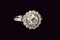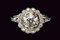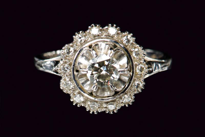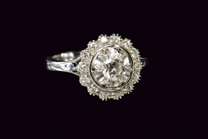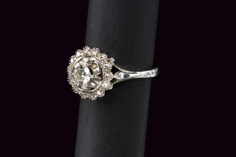 Anello oro bianco 750/000 con diamante centrale taglio vecchio da 0.2 ct ca contornato da venti diamanti taglio huit- huit per un totale di 0.55 ct ca. Misura 12, peso 6,5 gr.