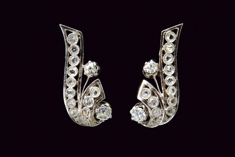 Orecchini realizzati in platino impreziositi da un totale di trentaquattro diamanti taglio Vecchia Europa e taglio rosetta per un peso totale stimato di 2.20 ct. Lunghezza mm 30, peso 12 gr.