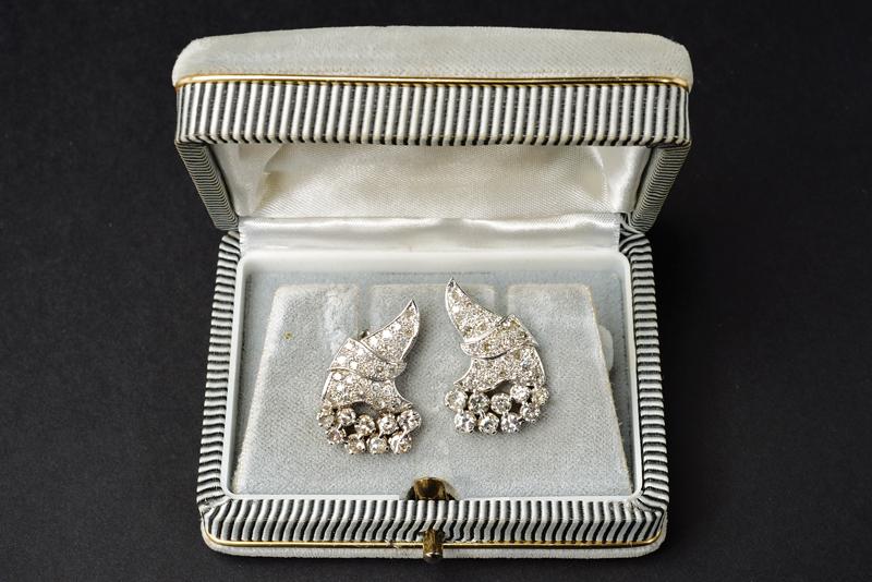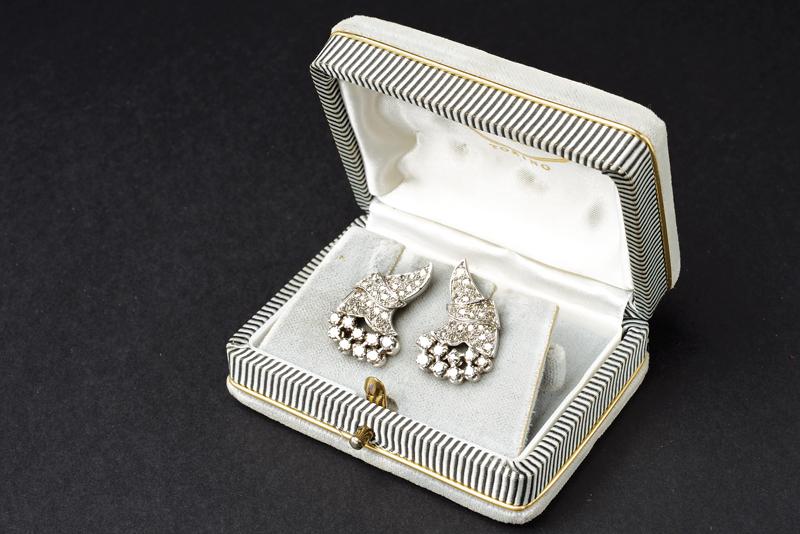Orecchini in platino ciascuno con una forma a cornucopia densamente impreziositi di diamanti taglio huit-huit. Il peso totale stimato dei diamanti è di 2.5 ct. Misure mm 25 x 15, peso 11,10 gr.