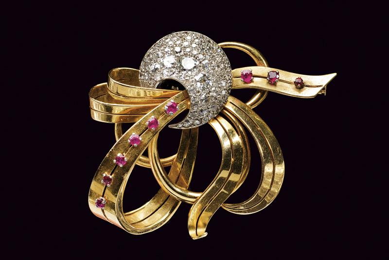 Lotto 128 | Spilla fiocco in oro giallo diamanti e rubini