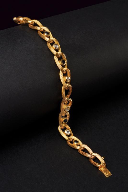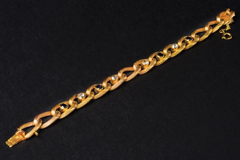 Bracciale a maglie traforate in oro giallo 750/000 con zaffiri incastonati e diamanti taglio rosetta. Chiusura con catenella di sicurezza. Lunghezza cm 17,5, peso 16,5 gr