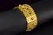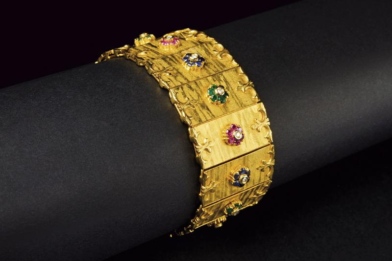 Bracciale semirigido realizzato con quindici grandi placche in oro giallo 750/000 satinato con decoro in rilievo di fiori di giglio e piccoli fiori centrali con diamanti huit-huit e petali di rubini, zaffiri e smeraldi tondi incastonati a griffe. Chiusura con catenella di sicurezza. Punzone orafo del periodo 1945-1968. Diametro cm 6, peso 74,4 gr .