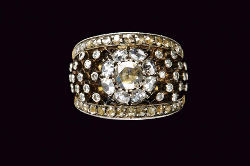 Anello a fascia con lavorazione a traforo realizzato in oro ed argento, diamante centrale taglio rosetta 0.56 ct, attorniato da 8 diamanti taglio rosetta per un totale 1.52 ct e rete di diamanti huit-huit per 0.28 cs tot. Misura 14, peso 11 gr