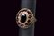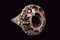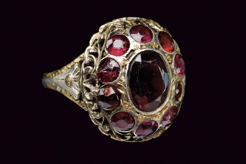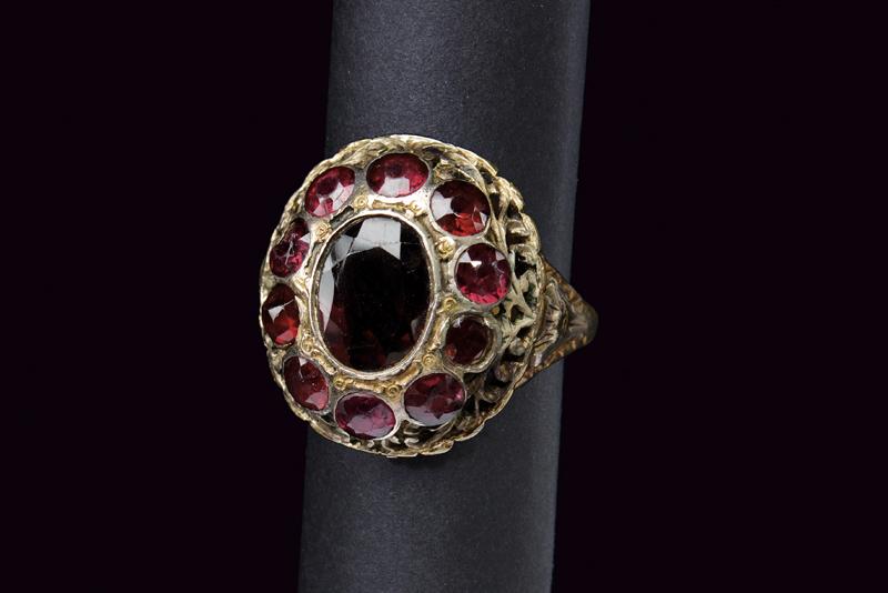 Anello margherita in oro 750/000 con lavorazione giorno impreziosita da granato centrale ovale con contorno di granati tondi più piccoli. Misura 16, peso 4,32 gr.