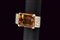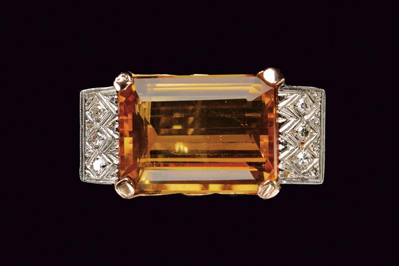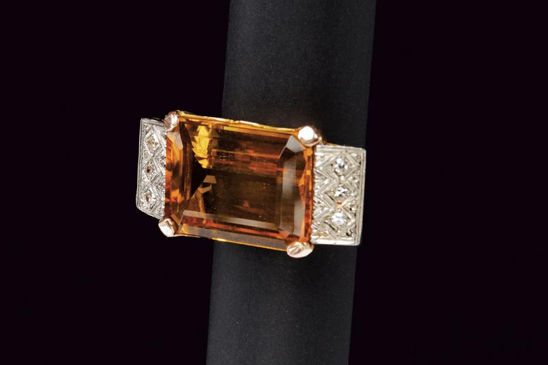 Anello in oro 750/000 con grande topazio madera ottagonale sfaccettato incastonato a griffe impreziosito da tre diamanti huit-huit per lato. Misure del topazio mm 20 x 15, misura dell'anello 19, peso 11,66 gr.