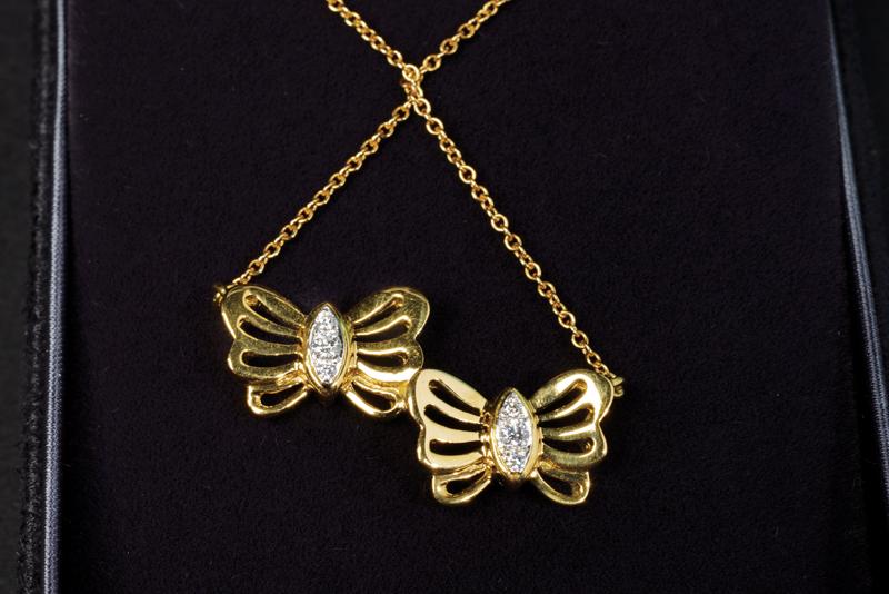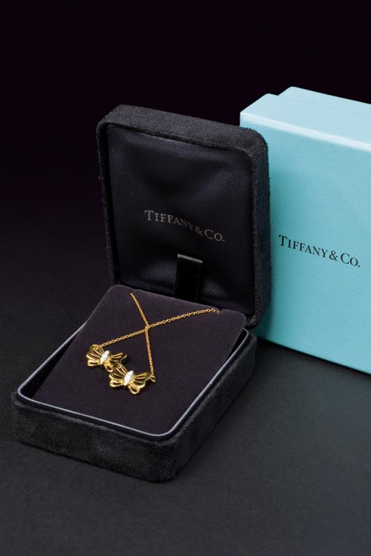 Collana girocollo Tiffany & Co 1989 realizzata in or giallo 18 kt , al centro due farfalle impreziosite ciascuna da tre diamanti tagli brillante per tot 0.10 ct ca. Punzoni sulla catena perfettamente leggibili, completo di scatola ed astuccio originali. Peso 5,13 gr.
