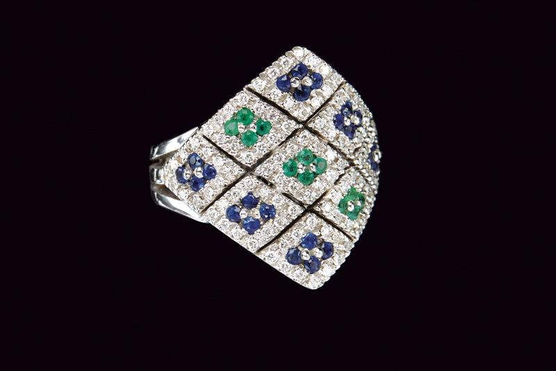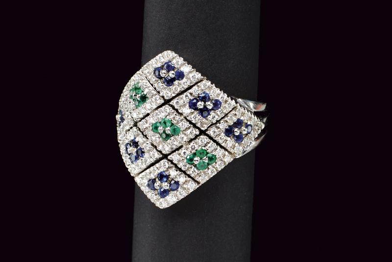 DAMIANI anello rombo realizzato in oro bianco 750/000 con pavé di diamanti zaffiri e smeraldi, punzone di fabbrica C *3181 AL. Misura 15, peso 14,6 gr