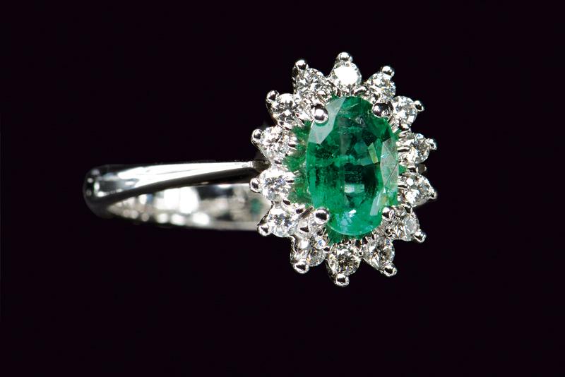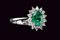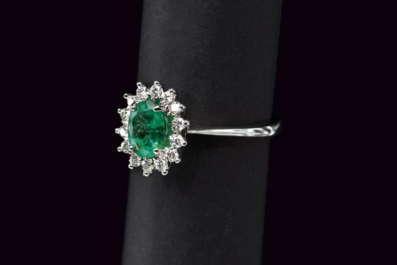 Anello MV modello rosetta realizzato in oro bianco 750/000 centrato da uno smeraldo taglio ovale di 0.61ct incastonato a griffe circondato da diamanti taglio brillante colore G, purezza VS, per un totale di 0.22 ct incastonati a griffe. Misura 14. Peso 4 gr.