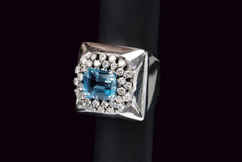 Grande anello in oro bianco, diamanti e acquamarina