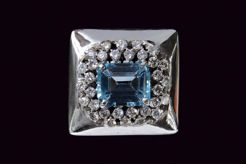 Grande anello di ispirazione geometrica realizzato con acquamarina rettangolare taglio smeraldo incastonata a griffe su alta base impreziosita da un doppio cerchio di diamanti taglio brillante. Oro bianco 750/000, misura 11, peso dell’anello 33 gr.