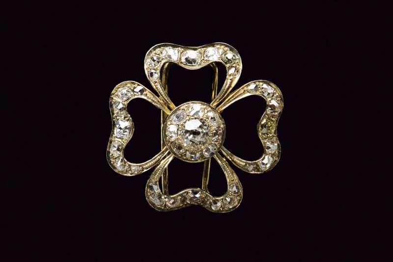 Spilla a forma di quadrifoglio con diamante centrale taglio vecchio di circa 0.50 ct e diamanti huit-huit a contorno per 1.0 ct ca, misure cm 3 x 3, peso 6,7 gr