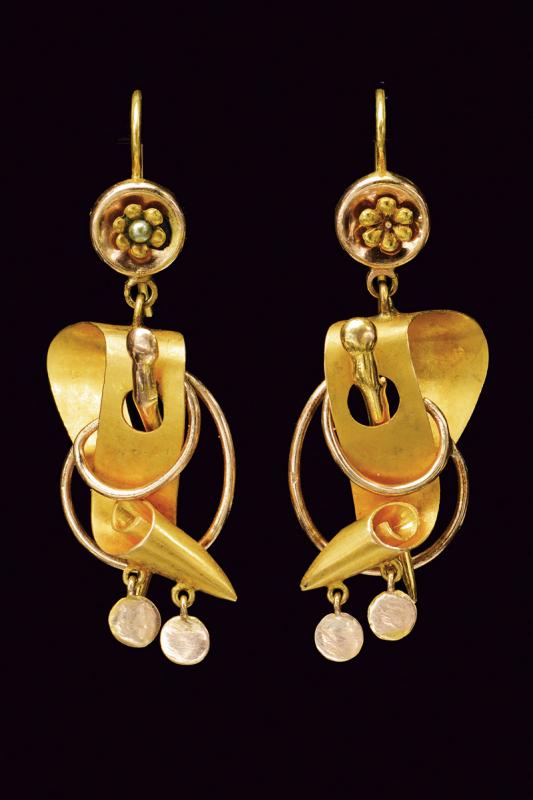 Orecchini in oro 750/000 con pendenti ed elementi tremblant rifiniti con ganci superiori. Misure mm 44 x 17 , peso totale 8 gr.