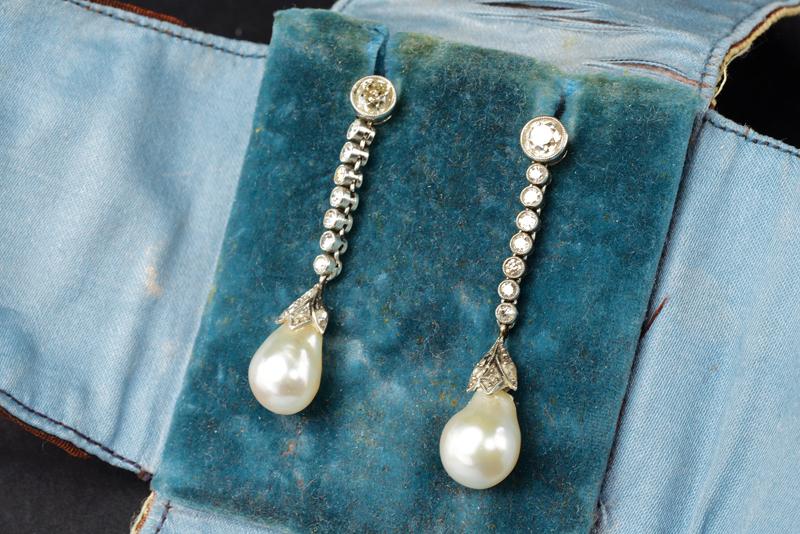 Paio di orecchini pendenti in oro bianco, ognuno con una fila di diamanti taglio vecchio di cui il più grande di 0.33 ct ca, terminante con una perla di mm 12 x 8 e mm 11 x 8, chiusura a vite in oro giallo con punzoni italiani con Fascio Littorio dell'oro 750/000, epoca 1935-1944. peso totale stimato dei diamanti 1.15 ct ca. Lunghezza cm 4 e cm 4,2, peso totale 7,12 gr