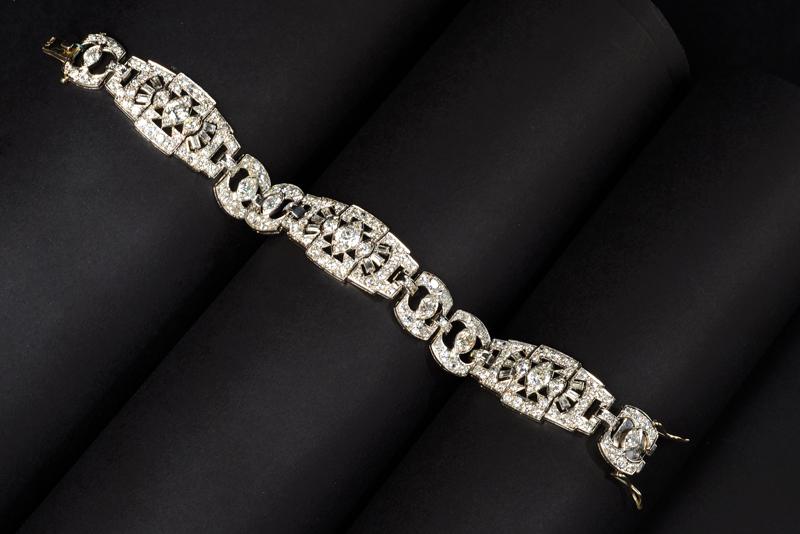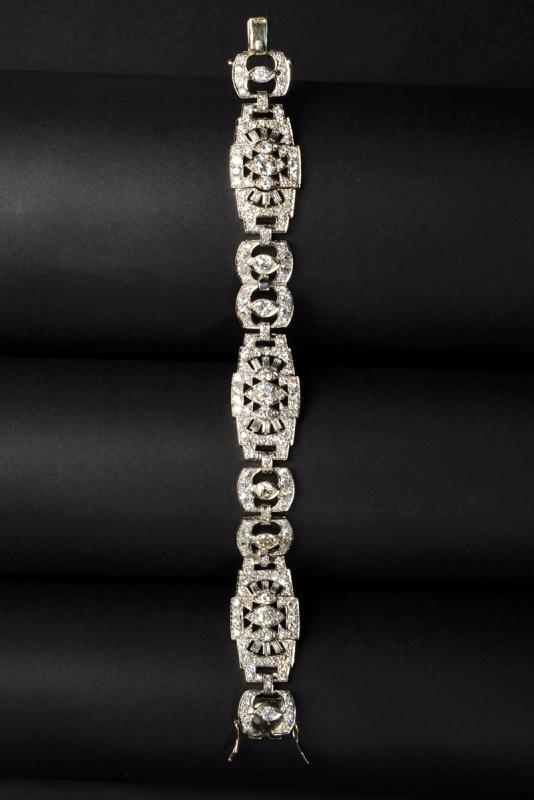 Bracciale modulare Art Déco in platino impreziosito da diamanti rotondi taglio vecchio per un peso totale stimato di 8.80 ct ca. Chiusura a cassetta con doppia sicurezza. Lunghezza cm 18 larghezza cm 3, peso 34,5 gr