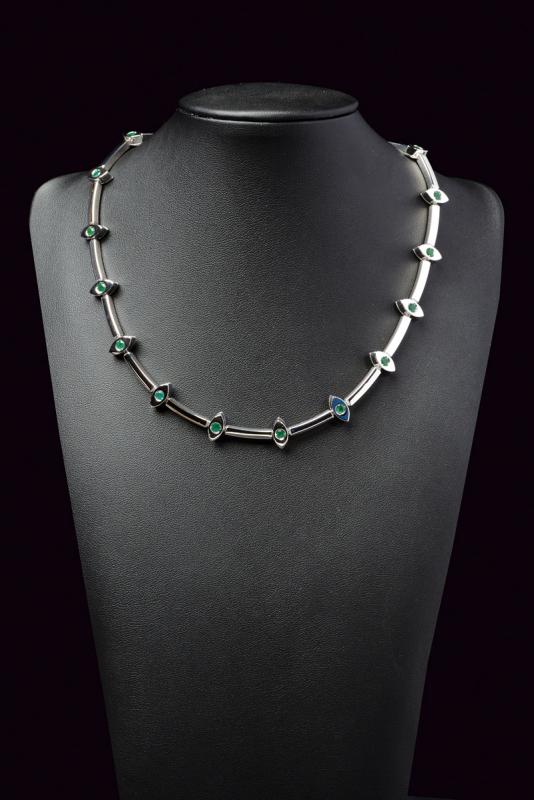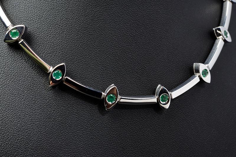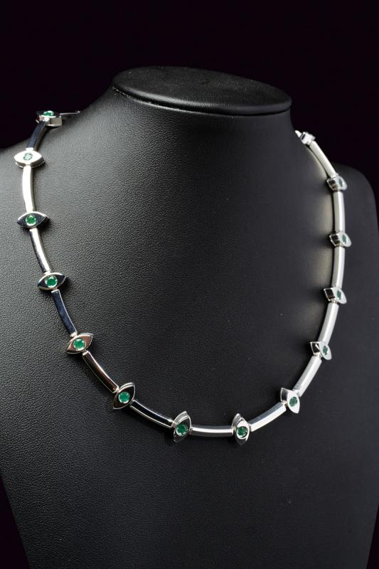 Collana semirigida in oro bianco 750/000 e smeraldi firmata Zanon. Misura cm 40, peso 39,4 gr.