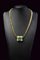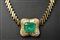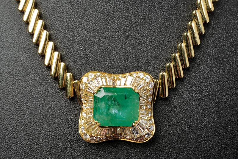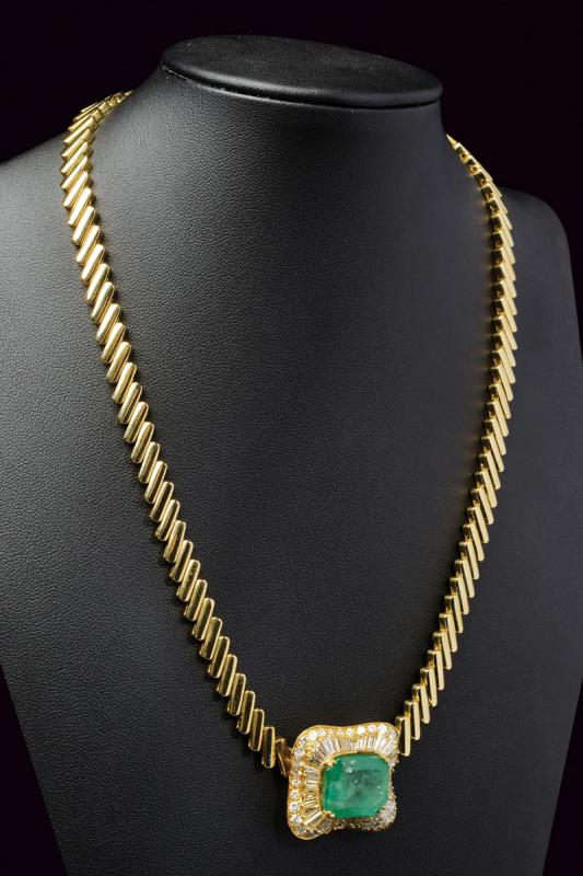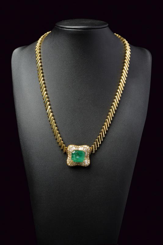 Collana girocollo a catena semirigida in oro giallo 750/000, elemento centrale in oro con al centro uno smeraldo taglio ottagonale di 11.0 ct e taglio trapezio e brillante per 5.0 ct ca. Chiusura punzonata 750 in losanga. Peso 77 gr