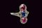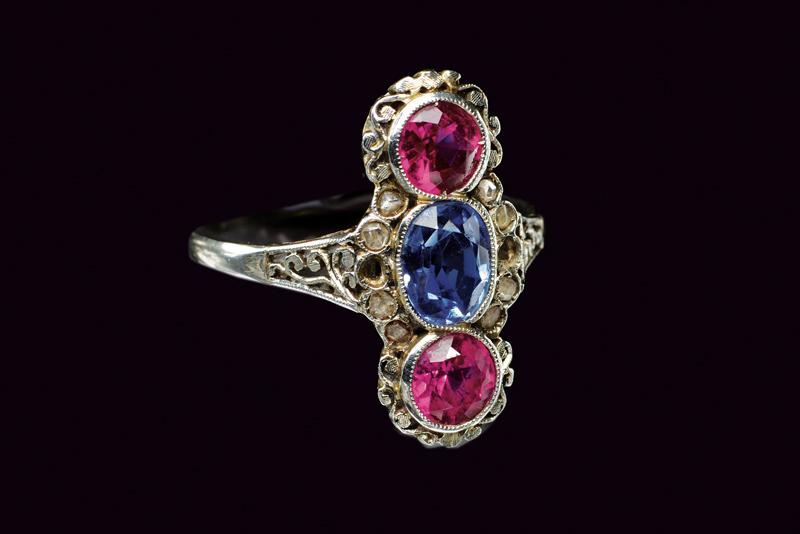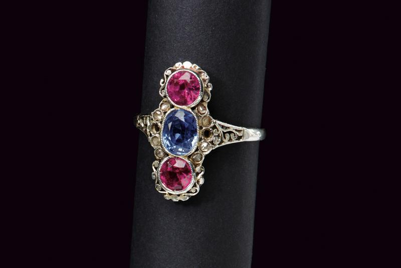 Anello in platino con zaffiro ovale centrale da 1.0 ct ca, affiancato da due rubini tondi dal peso complessivo stimato di 1.5 ct con controrno di diamanti taglio rosetta. misura 14, peso 3,5 gr