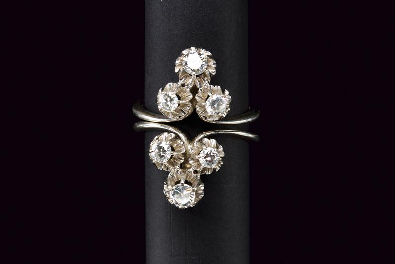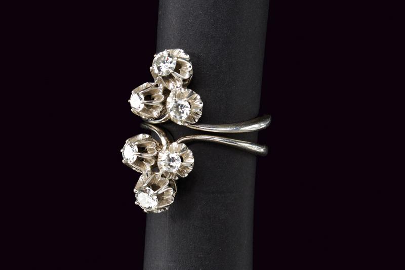 Due anelli in oro bianco 750/000 simmetrici che possono essere indossati insieme uno di fronte all'altro o separatamente su due dita, ciascuno impreziosito da tre diamanti a taglio brillante. Il peso totale stimato dei diamanti è di 1.0 ct. Punzone 750 impresso sui due anelli. Misura 17, peso 10,64 gr.