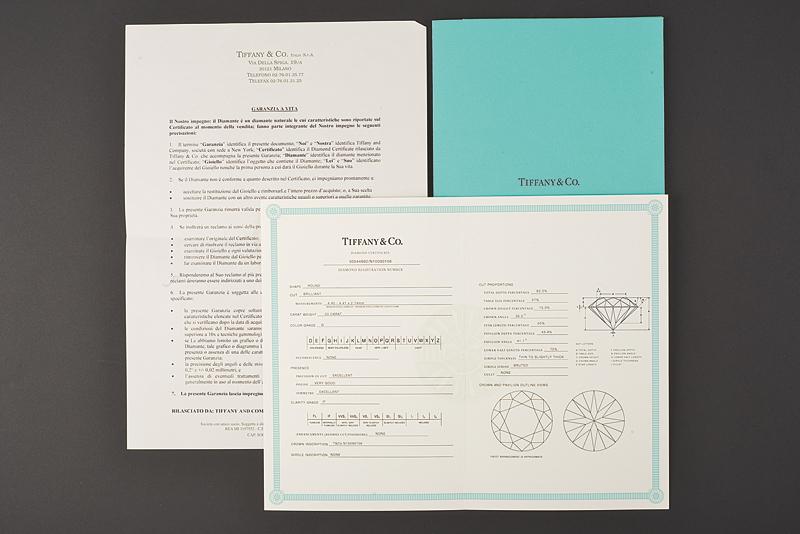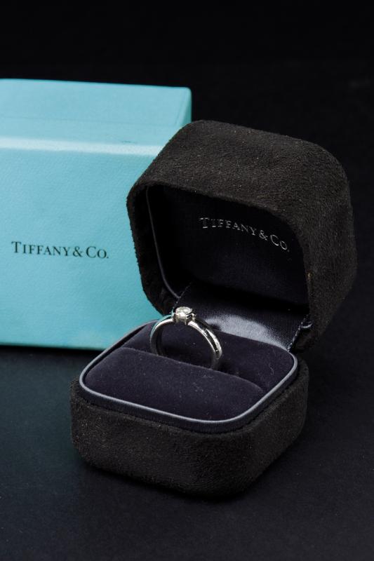 Tiffany & Co anello solitario in platino con diamante taglio brillante 0.33 ct, colore G, purezza IF, completo di astuccio e scatola originale e certificato gemmologico Tiffany & Co 30544692/N10090156. Misura 9. Peso 8,67 gr