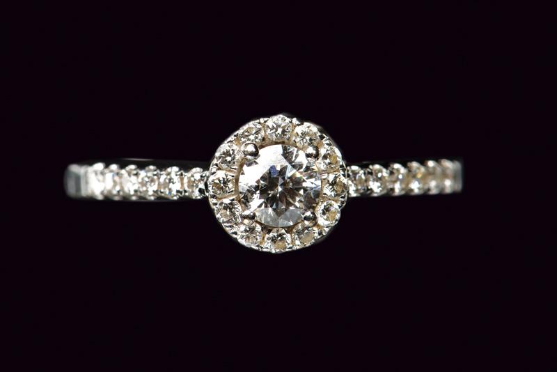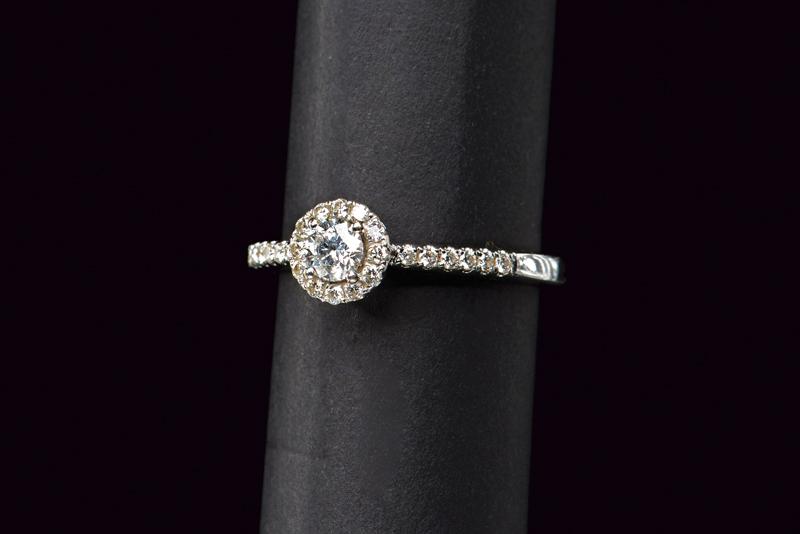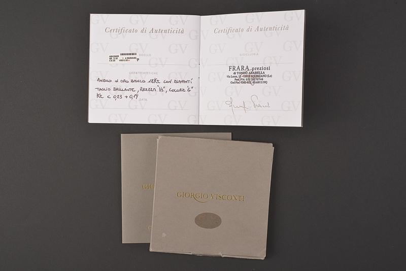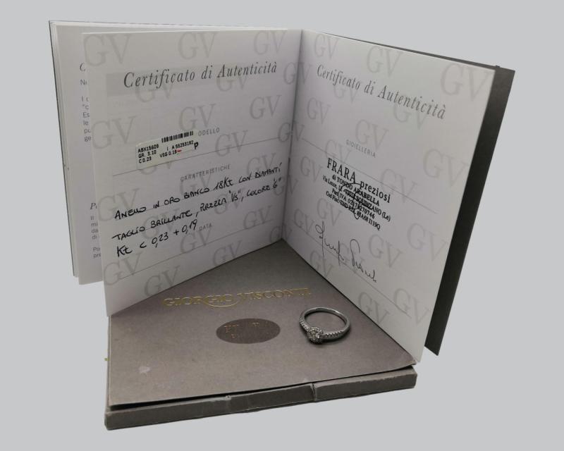 GIORGIO VISCONTI anello solitario realizzato in oro bianco 750/000 con diamanti taglio brillante colore G, purezza VS, per un totale di 0.42 ct il centrale di 0.23 ct . Misura 12. peso 3,15 gr. Completo di certificato e garanzia originali