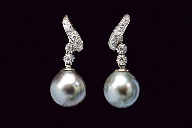 Orecchini con perle di Tahiti e diamanti, realizzati in oro bianco 750/000 con una coppia di perle di Tahiti a goccia da 145 mm, completate da due file incrociate di diamanti a taglio brillante per un totale di 0.8 ct ca. Gli orecchini sono rifiniti con perni in oro bianco e chiusura a farfalla. Lunghezza cm 3,5, peso 14 gr