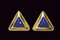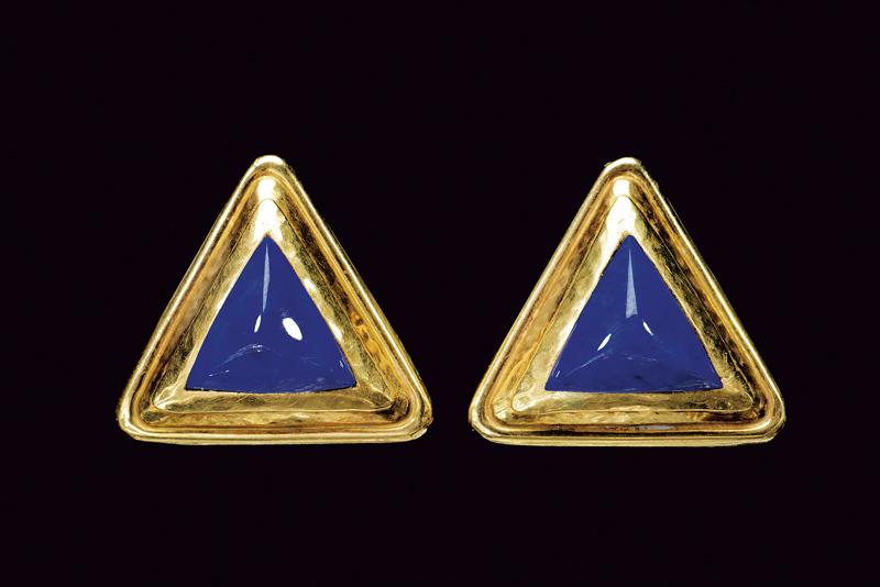 Orecchini a forma triangolare in oro giallo 750/000 con lapislazzuli, firmati Gaston Lebò, punzoni oro 750 e marchio orafo. Misura 3 x 3 cm peso 15 gr