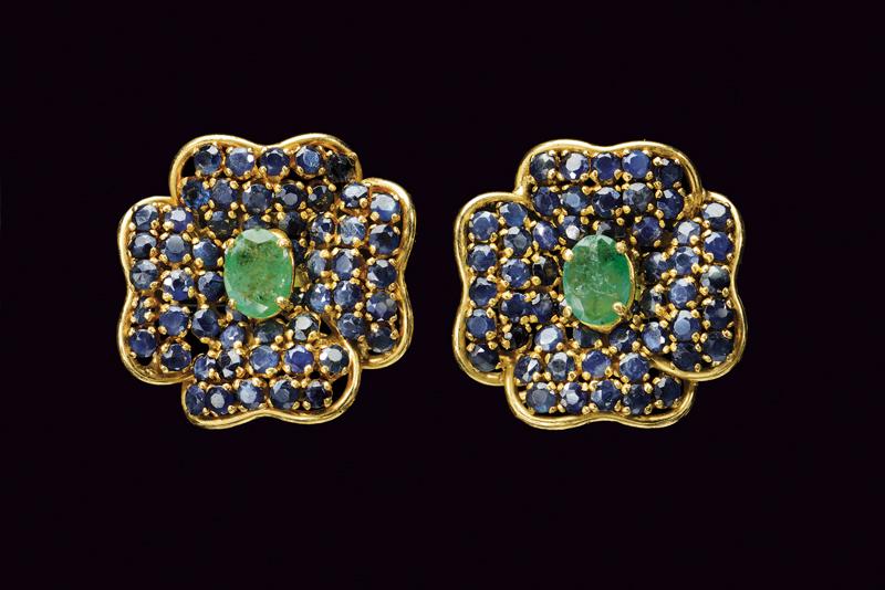 Coppia di orecchini a clip firmati Crea in oro giallo 750/000, due grandi fiori centrati da smeraldi taglio ovale contornati da zaffiri disposti a pavé. Peso tot 20 gr.