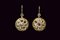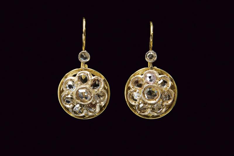 Paio di orecchini a monachella modello a toppa in oro giallo ed argento ciascuno realizzato come un fiore impreziosito da otto diamanti taglio rosetta diametro cm 1,5 peso 6,94 gr.
