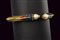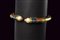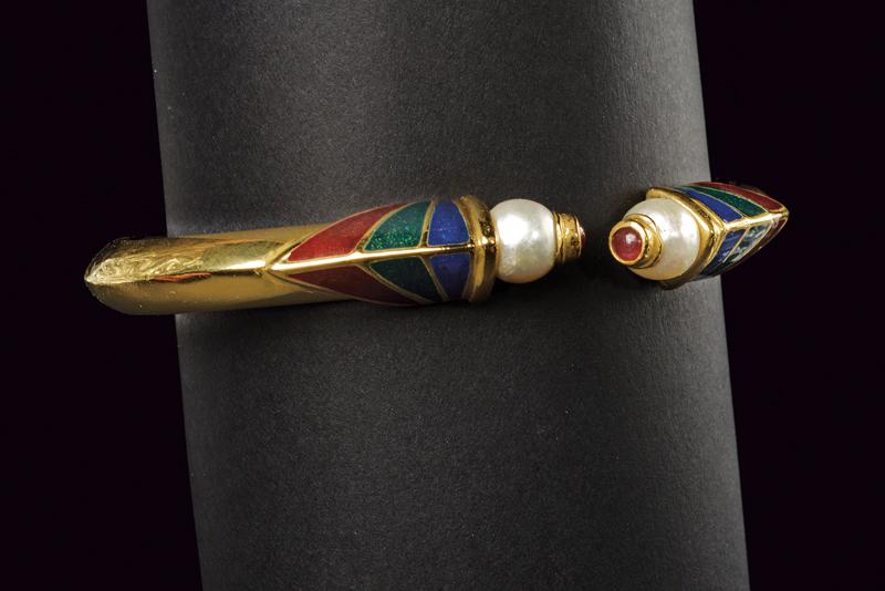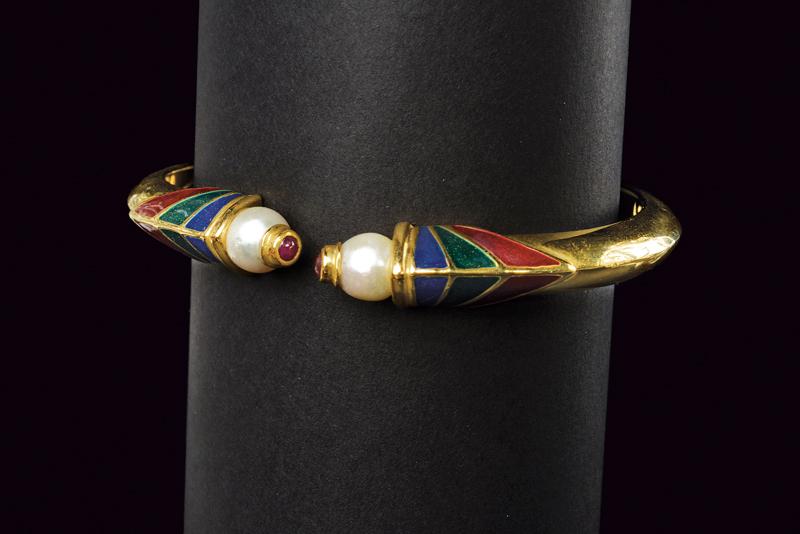 Bracciale rigido a molla in oro 750/000 con agli estremi una perla e smalti colorati, dimensioni mm 60 x 50, peso 23,40 gr