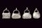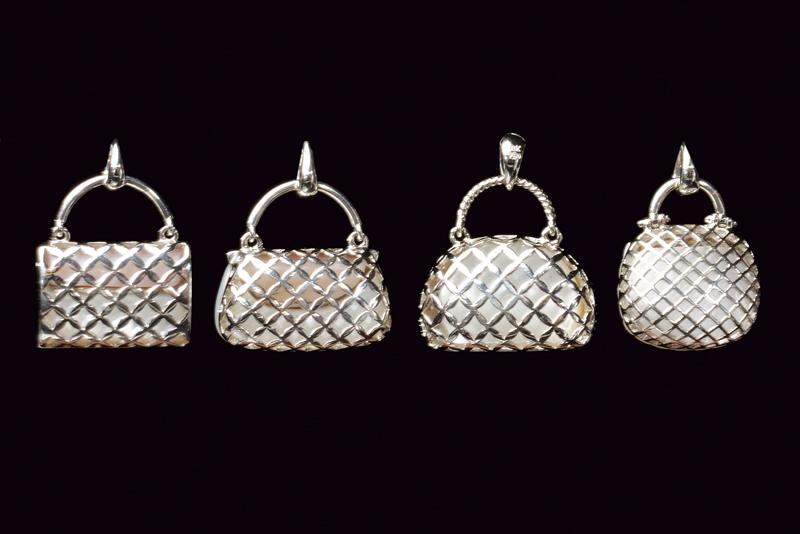 Lotto di quattro ciondoli / charms a forma di borsetta realizzati in oro bianco 750/000 e madreperla, ognuno di forma differente. Dimensioni delle borse mm 25 x 22 e mm 23 x 23 mm, peso totale 24,3 gr