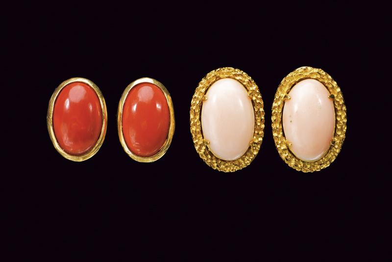 Lotto composto da due paia di orecchini in oro 750/000, un paio con cabochon di corallo rosso ed il secondo con cabochon di corallo rosa. Misure mm 15 x 20 e 12 x 16, peso totale 15 gr Il lotto é stato identificato come contenente materiali organici che possono essere sottoposti a restrizioni per l'importazione o l'esportazione. Chi fosse interessato é pregato di mettersi in contatto con i nostri uffici prima dell'asta