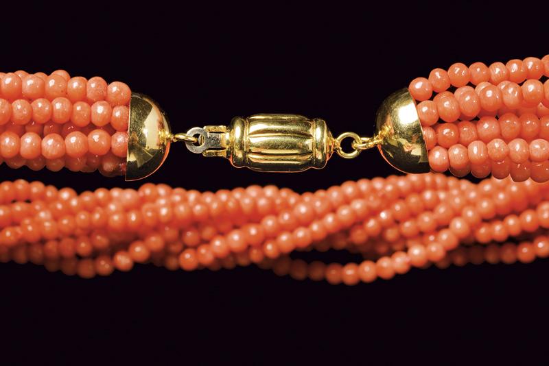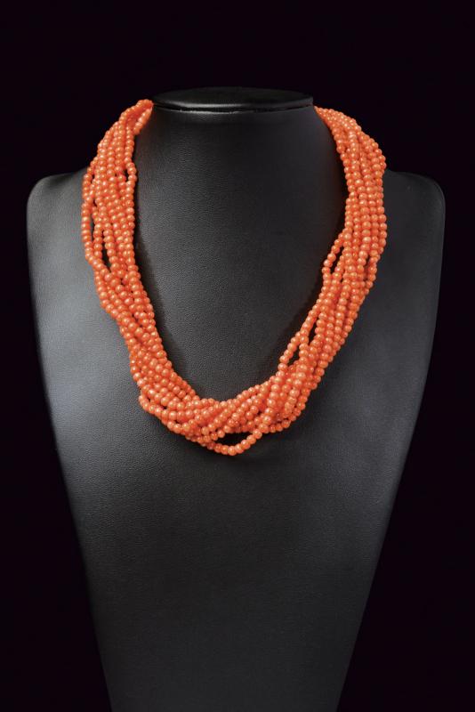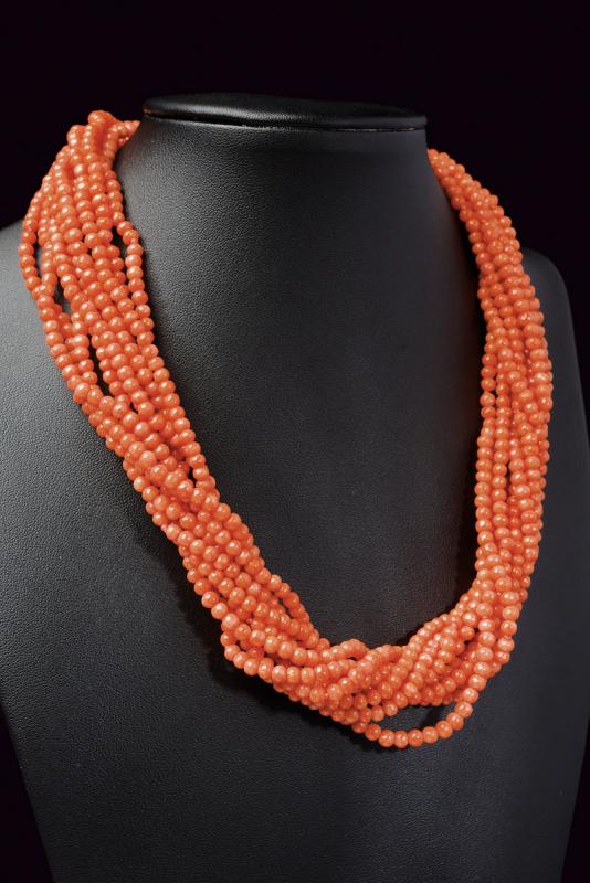 Collana torchon a 10 fili di microboulle di corallo antico di Sciacca, 4 mm di diametro tagliate a mano, chiusura in oro giallo 750/000, lunghezza della collana 42 cm (senza la chiusura) 44 cm con chiusura, peso 106 gr. Il lotto é stato identificato come contenente materiali organici che possono essere sottoposti a restrizioni per l'importazione o l'esportazione. Chi fosse interessato é pregato di mettersi in contatto con i nostri uffici prima dell'asta