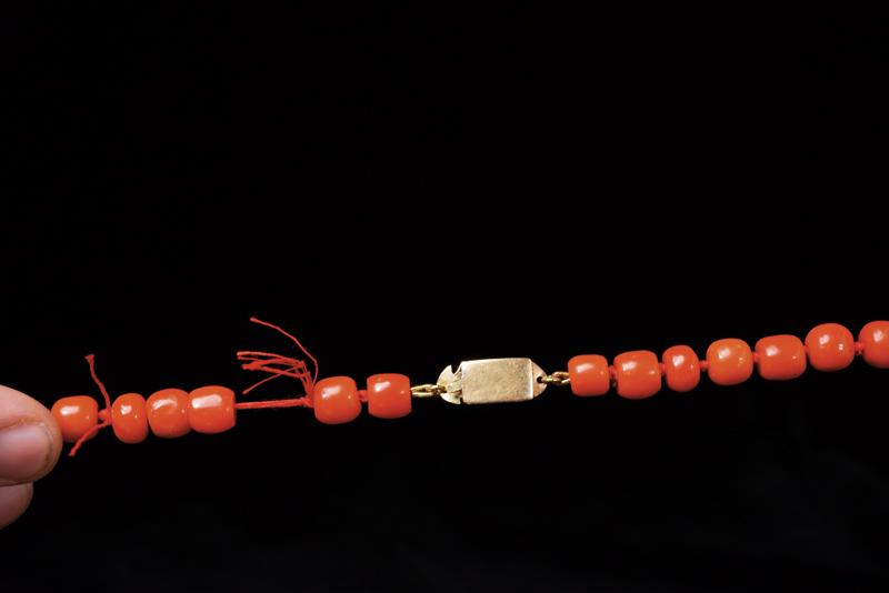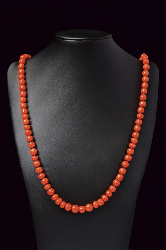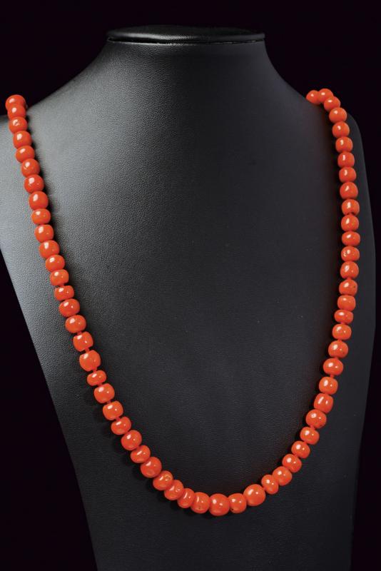 Collana realizzata con un filo di perle di corallo rosso tagliate a mano di misura da mm 8 a mm 10 con chiusura a cassetta in oro giallo. Lunghezza cm 90. Peso 81,6 gr Il lotto é stato identificato come contenente materiali organici che possono essere sottoposti a restrizioni per l'importazione o l'esportazione. Chi fosse interessato é pregato di mettersi in contatto con i nostri uffici prima dell'asta