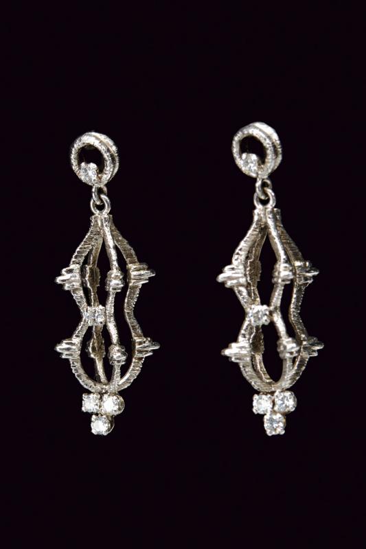 Paio di orecchini realizzati in oro bianco 750/000 a motivo geometrico impreziositi da un totale di ventisei diamanti taglio brillante, tredici per orecchino. Lunghezza mm 40, peso totale 12 gr.