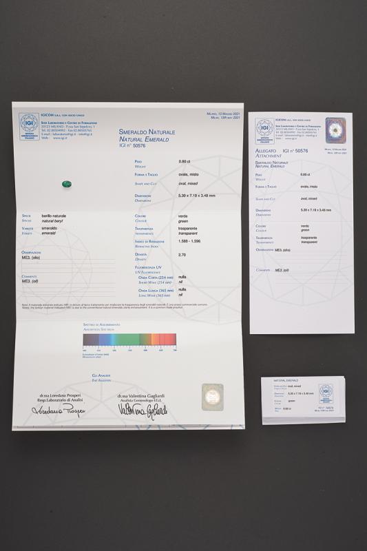 Smeraldo ovale taglio misto colore verde di 0.81 ct (5,30 x 7,18 x 3,47 mm) accompagnato dal certificato gemmologico IGI nr. 50576 del 13 Maggio, 2021