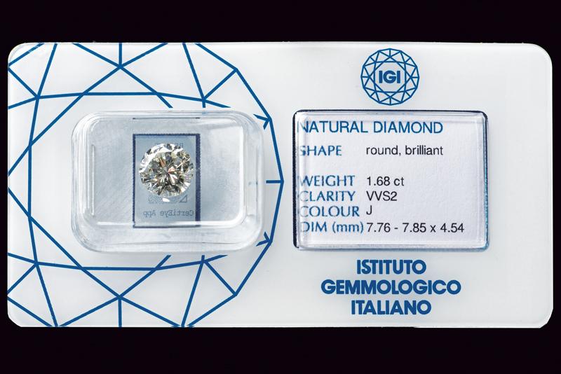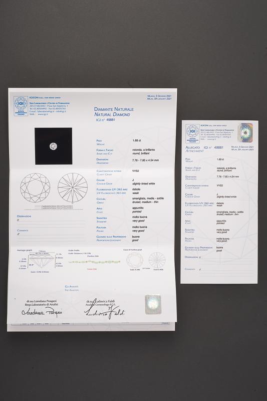 Diamante tondo taglio brillante colore J, purezza VVS2 da 1.68 ct (7,76 x 7,85 x 4,54 mm) accompagnato da certificato IGI nr. 49881 del 05 gennaio 2021