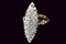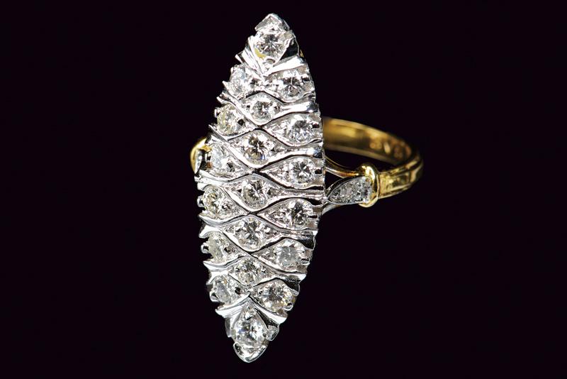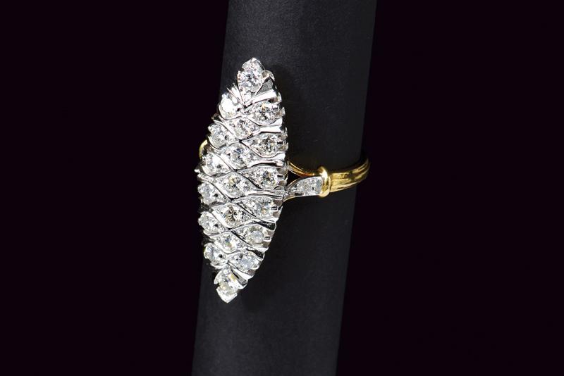 Anello marquise in oro due colori 750/000 con diciannove diamanti (G/VS) tondi taglio brillante incastonati a griffe del peso complessivo di 1.45 ct. Punzoni: 145 (TCW), G/VS (colore e purezza dei diamanti), punzone orafo e Testa d'Aquila. Misure del pavé mm 35 x 10, misura dell’anello 15, peso 7,90 gr.
