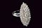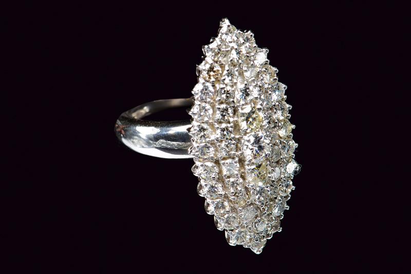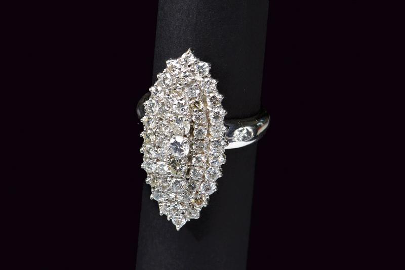Anello marquise in oro bianco 750/000 con quarantanove diamanti tondi taglio brillante incastonati a griffe disposti a pavè del peso complessivo di 2.30 ct.ca. Punzone 750 inscritto in losanga. Misure del pavé mm 31 x 15, misura dell’anello 15, peso 10,75 gr.
