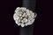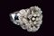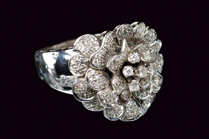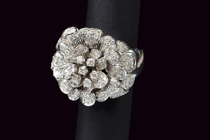 Anello tridimensionale a forma di fiore realizzato in oro bianco 750/000. Ogni petalo è impreziosito da diamanti tondi taglio brillante disposti a pavé ed ulteriori sette diamanti taglio brillante che spiccano al centro dell'anello. Punzonato 750 inscritto in losanga e punzone * 895NA. L'anello ha un diametro di 2,5 cm, misura dell'anello 13, peso 19,4 gr.